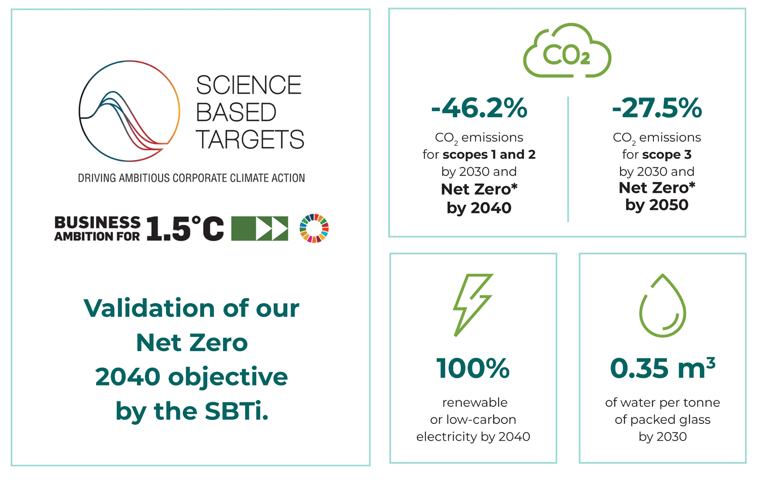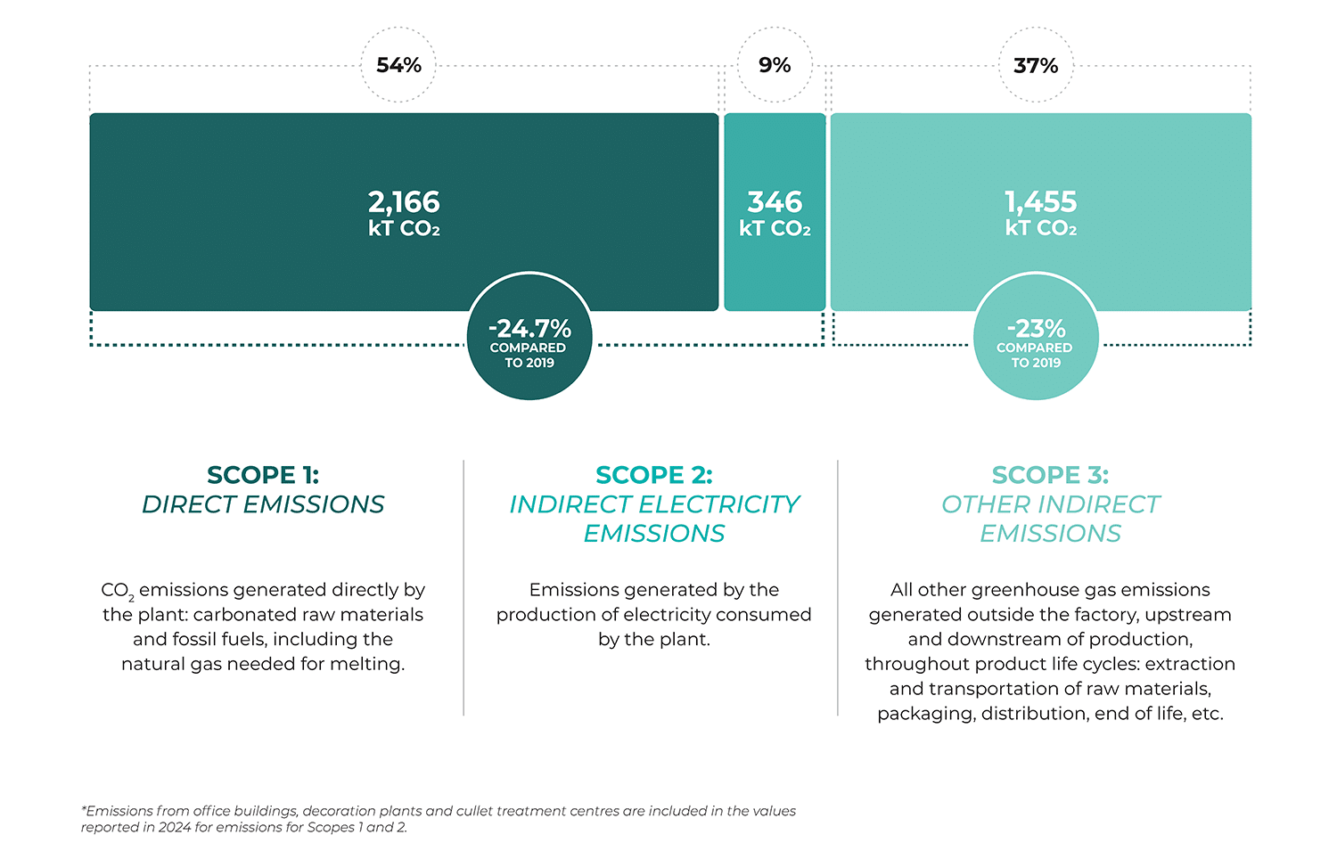 Verallia’s Net Zero trajectory, validated by the SBTi, commits the Group to reducing CO₂ emissions by 90% for scopes 1 and 2 by 2040, with 10% offsetting. For scope 3, the target is a 90% reduction by 2050.